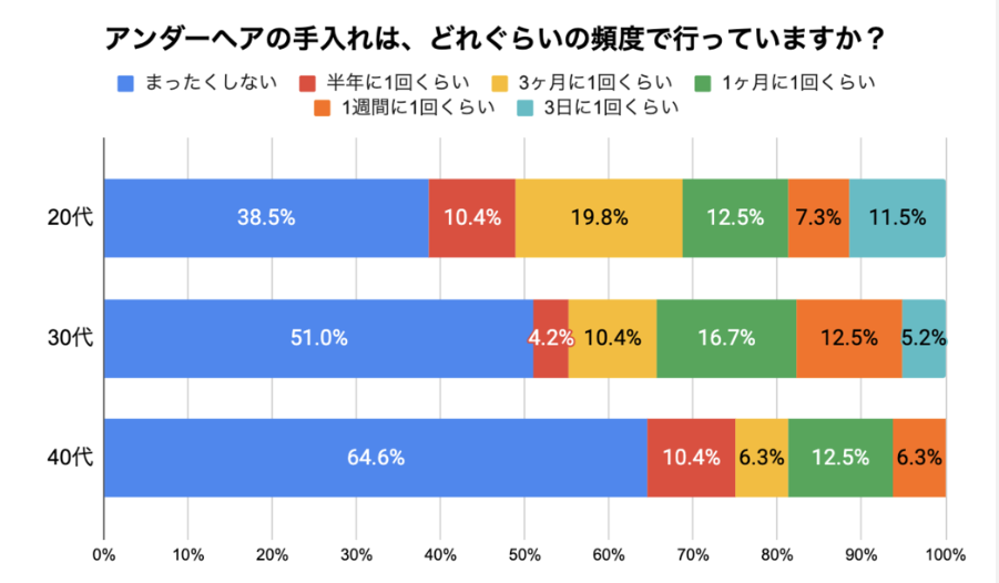 20代は6割以上が定期的にアンダーヘアの手入れしていますが、30代以降になると半数以上がアンダーヘアを全く処理していないと回答。